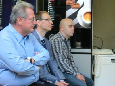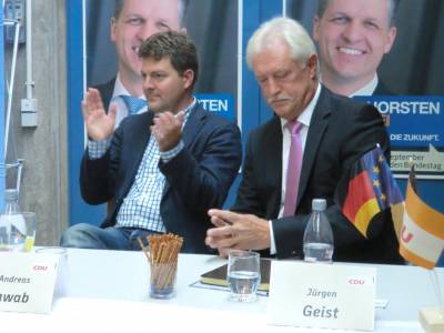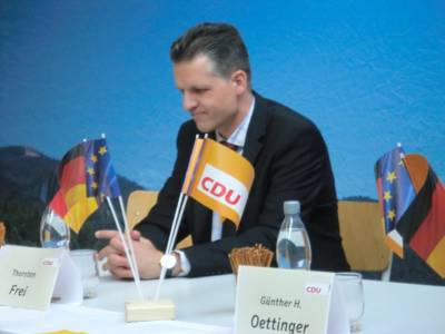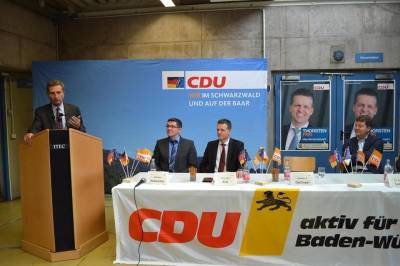 der EU-Kommissar Guenther H. Oettinger im Rahmen des Bundestagswahlkampf 3013 mit Thorsten Frei und Dr. Andreas Schwab bei MEKU in Dauchingen
